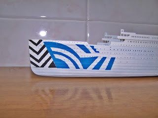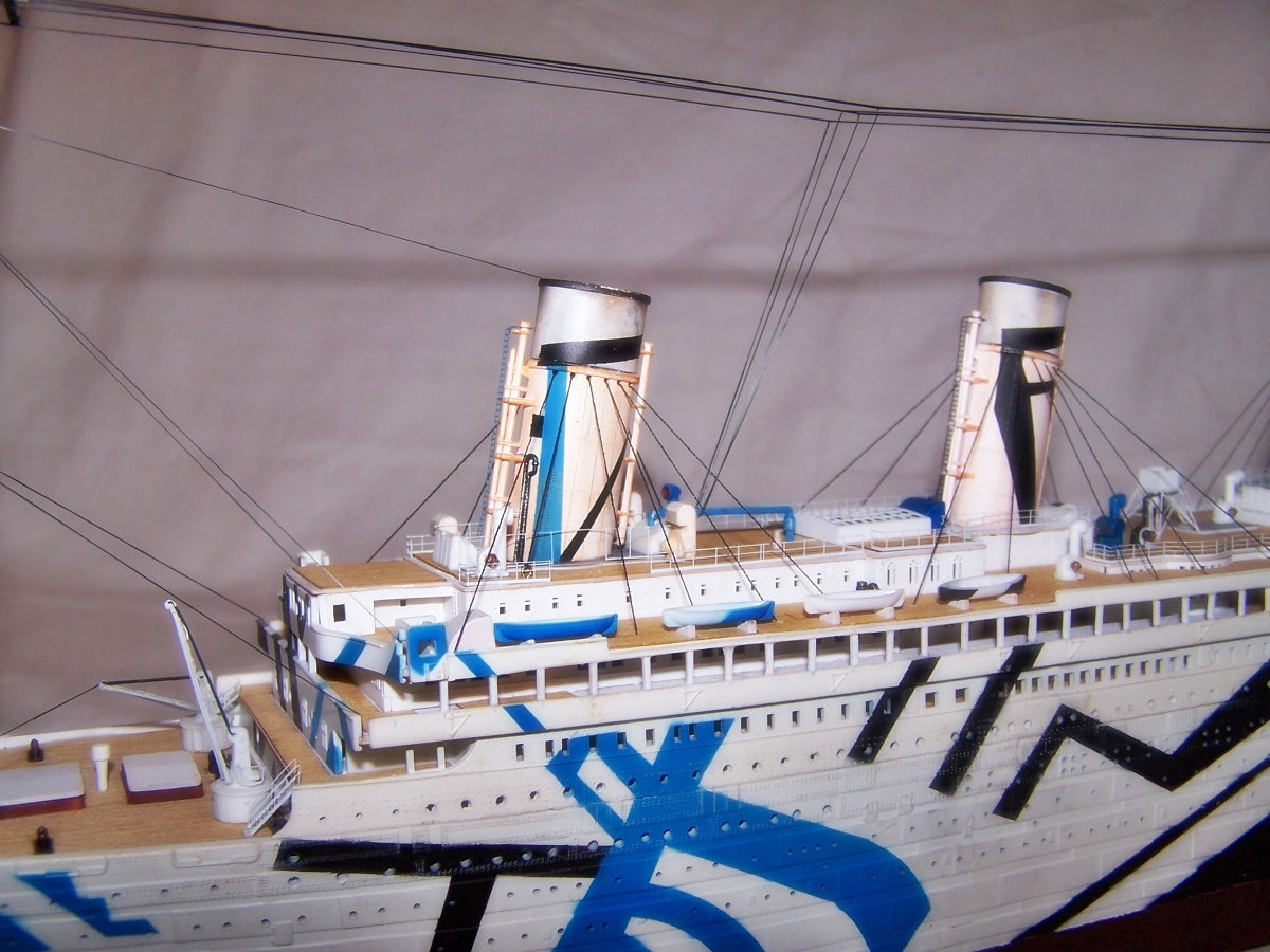 se trata del archiconocido RMS TITANIC y la cuestion es que lo queria convertir en su hermano gemelo el rms olympic con el esquema de 1918 muy llamativo como vereis mas adelante en las fotografias,llevo algun tiempo buscando los cambios exteriores para hacer los combios oportunos y poco a poco voy encontrando varias cosillas a ver como acaba la cosa al final del proyecto pues hay algunas cosas que requieren de bastante cuidado para hacer los cambios y bastante vistosos.el primero y mas importante es el esquema de camuflaje sustiuyendolo por el mitico balnco y negro y como me gustan los retos y no queria hacer el titanic que todo el mundo hace,ese quedara para mas adelante empezamos con la fiesta.